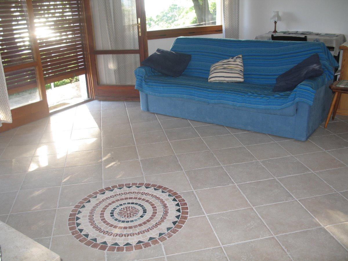L'intero piano terra, adibito ad appartamento, è a disposizione degli ospiti, che potranno usufruire di una camera da letto matrimoniale, un ampio salone con caminetto e divano letto due posti, disimpegno con letto singolo, cucina abitabile fornita di tutti gli accessori, bagno con doccia, zona lavanderia con lavatrice e asciugatrice. Tutte le stanze, affacciate sul giardino fronte mare, dispongono di porta ingresso indipendente.